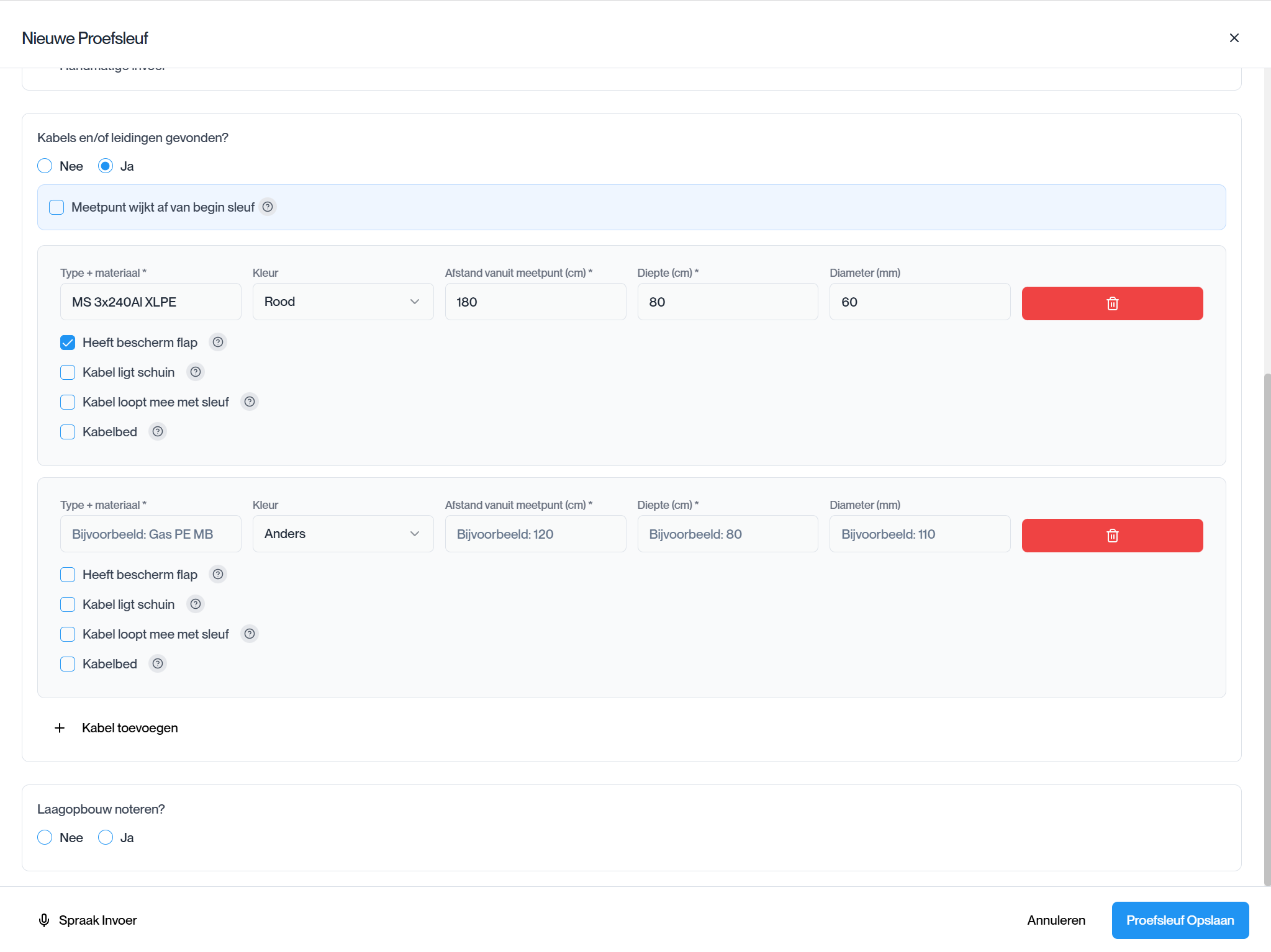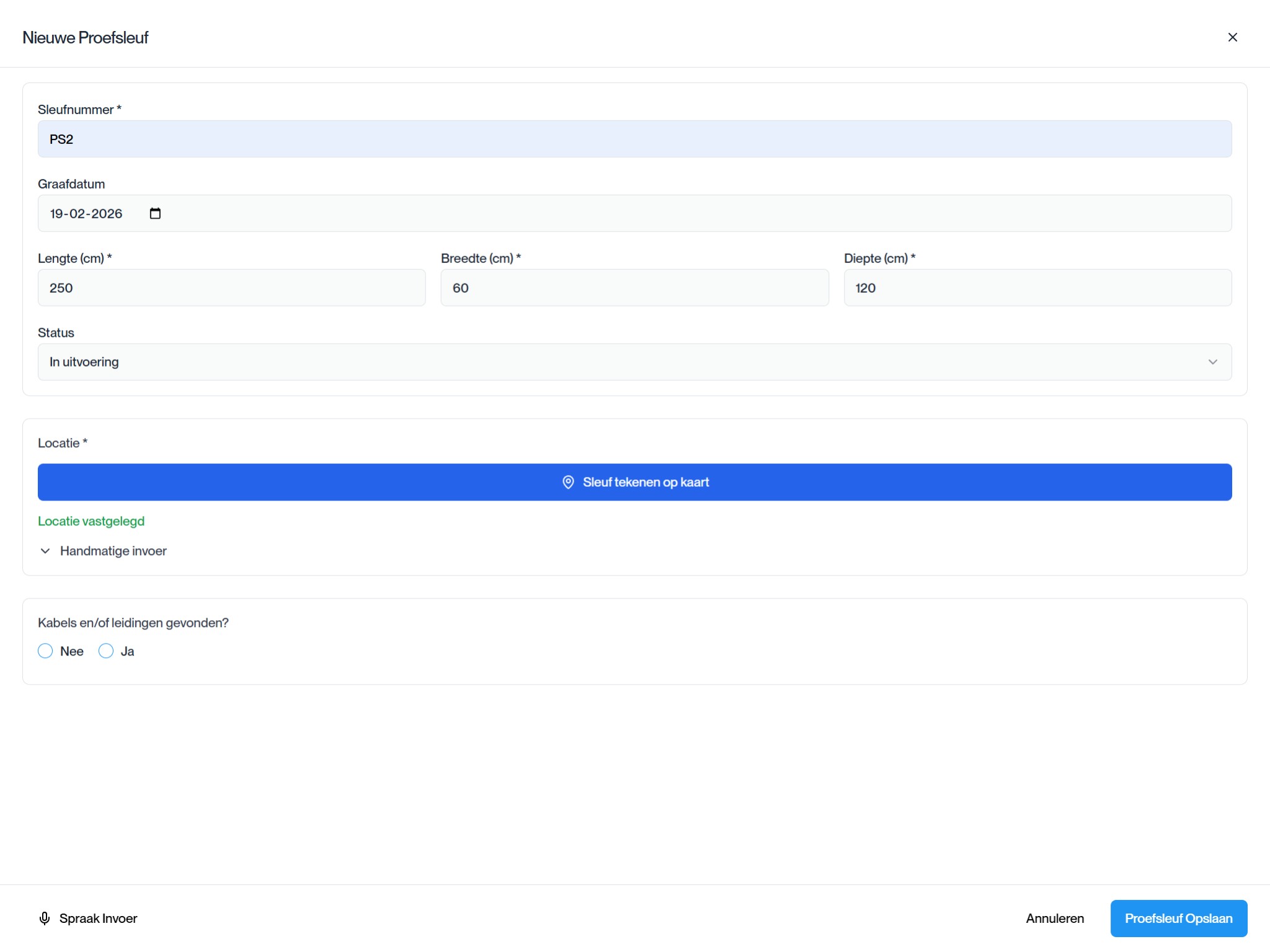 Voor situaties waar je zelf de controle wilt houden. Teken de sleuf op de kaart, geef de exacte afmetingen op en registreer alle kabels en leidingen met precisie.